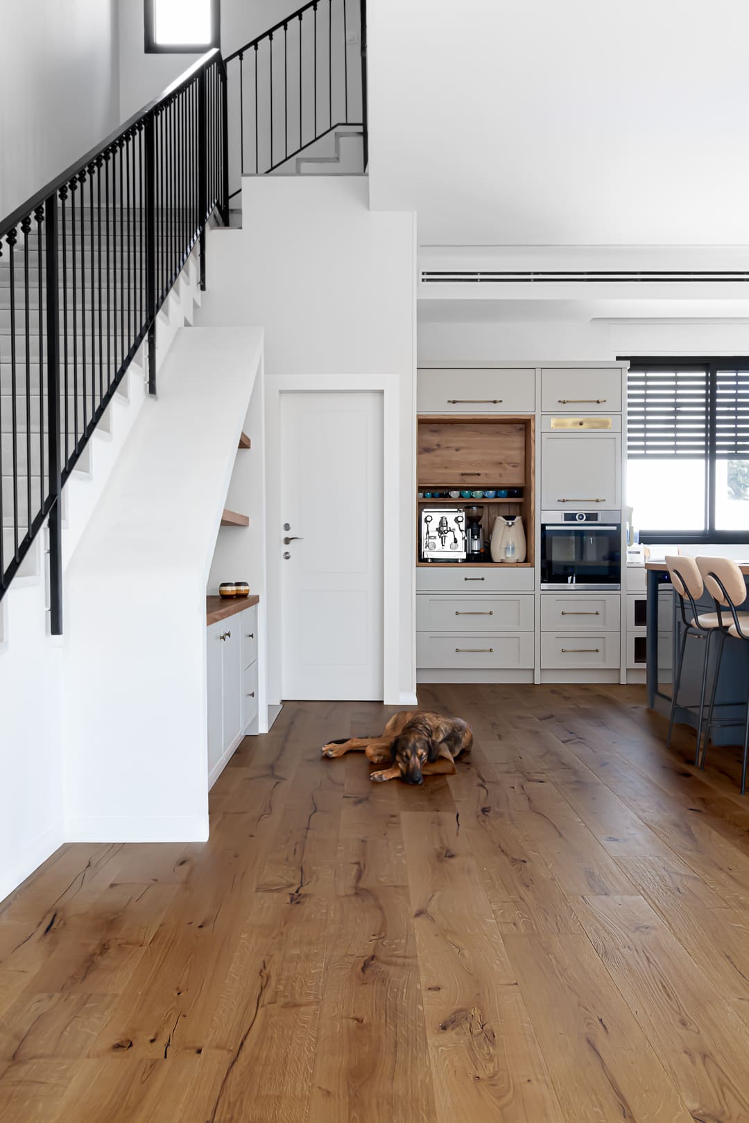 הפרקט הנבחר: פרקט עץ אלון טבעי, סןפר כפרי.רוחב 22 ס"מ, גימור לכה.