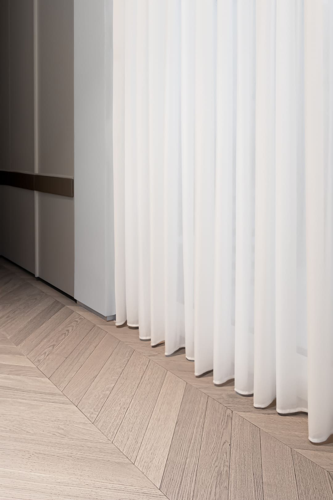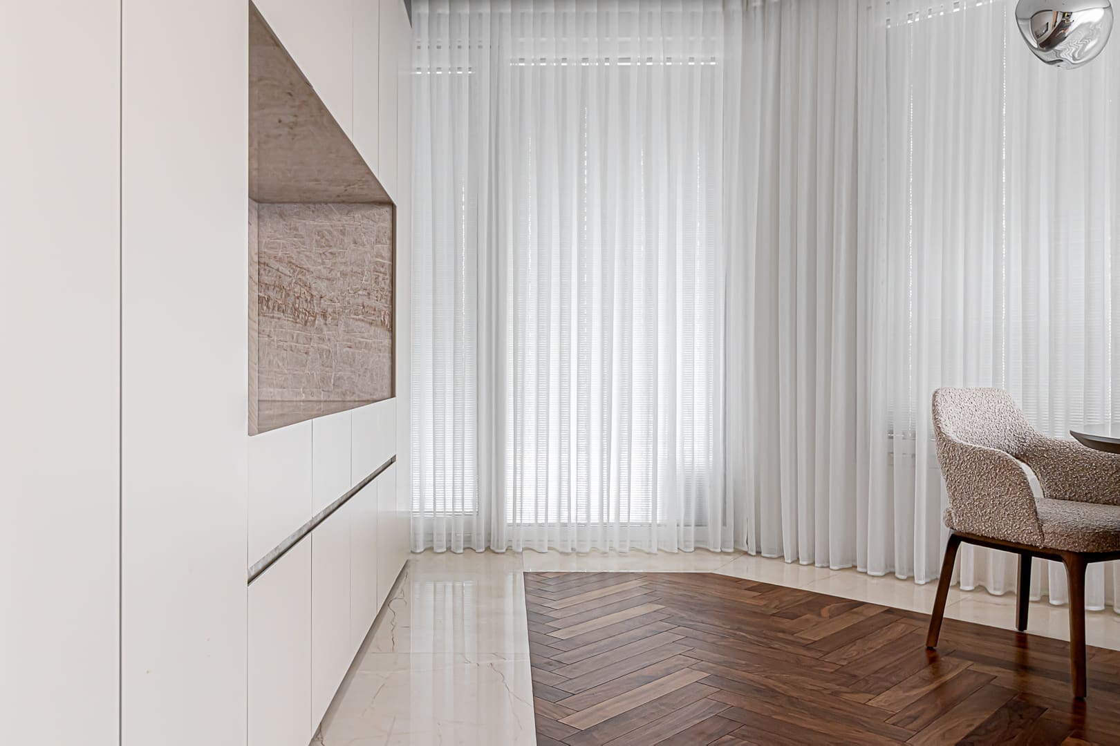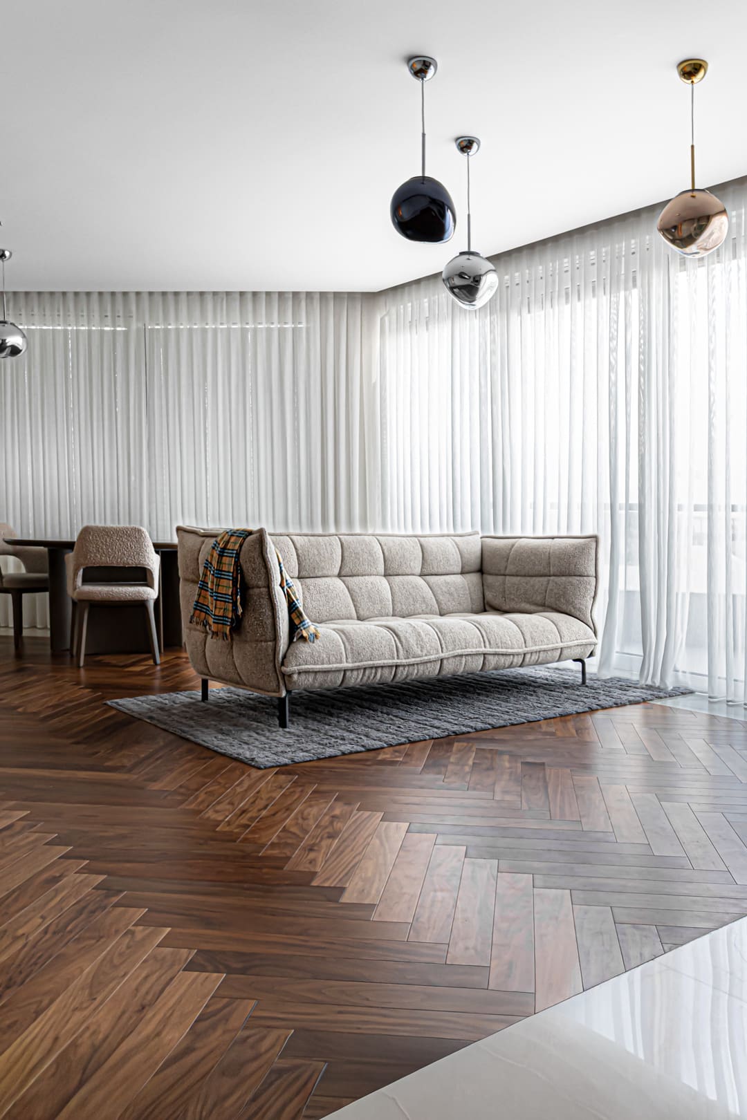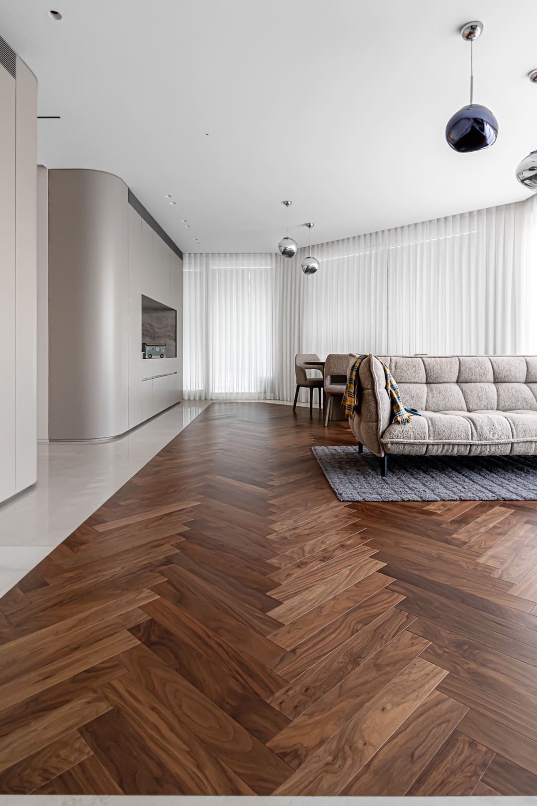 הפרקט הנבחר: סדרת הרמוניקו בהתקנת שברון והתקנת קורות מבית salis איטליה. ניתן להבחין שבאיזורים מסויימים גיוונו עם אגוז פישבון גמר לכה.