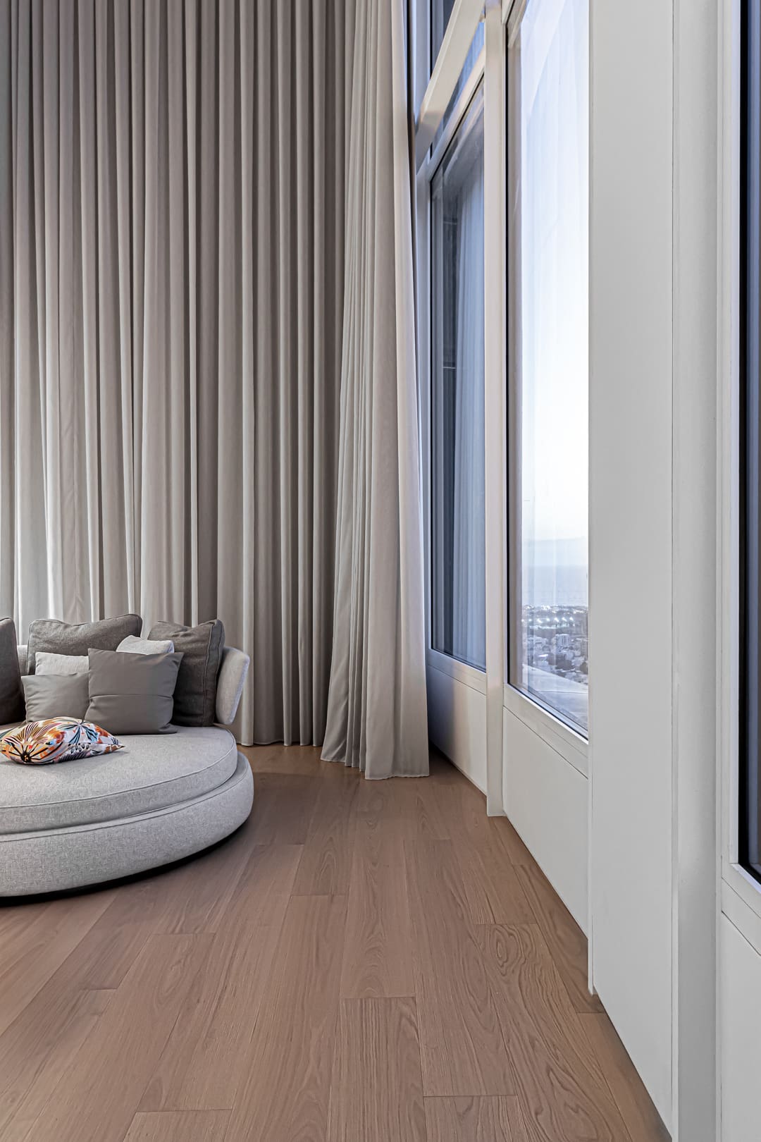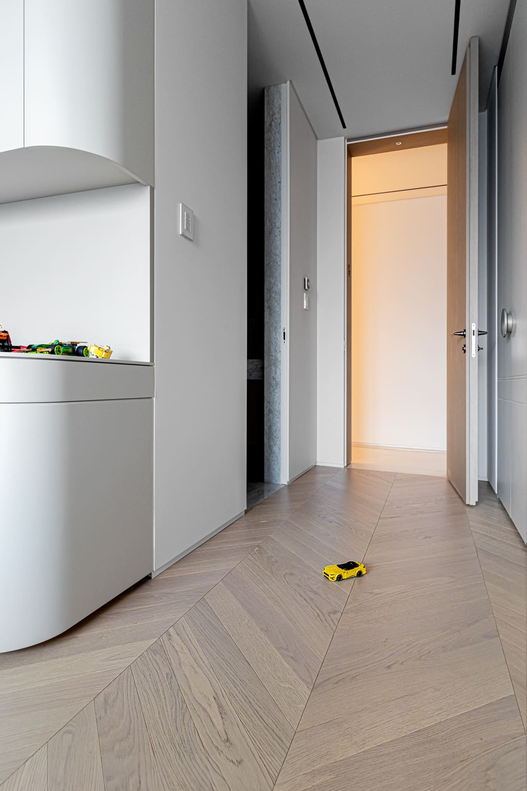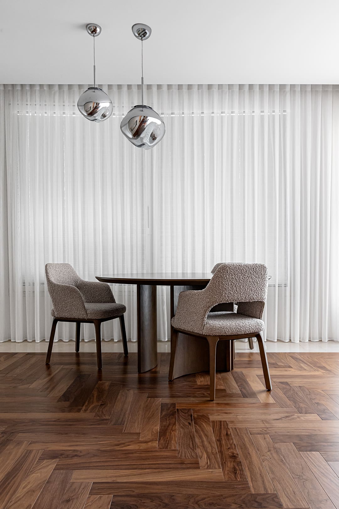 הפרקט הנבחר: סדרת הרמוניקו בהתקנת שברון והתקנת קורות מבית salis איטליה. ניתן להבחין שבאיזורים מסויימים גיוונו עם אגוז פישבון גמר לכה.